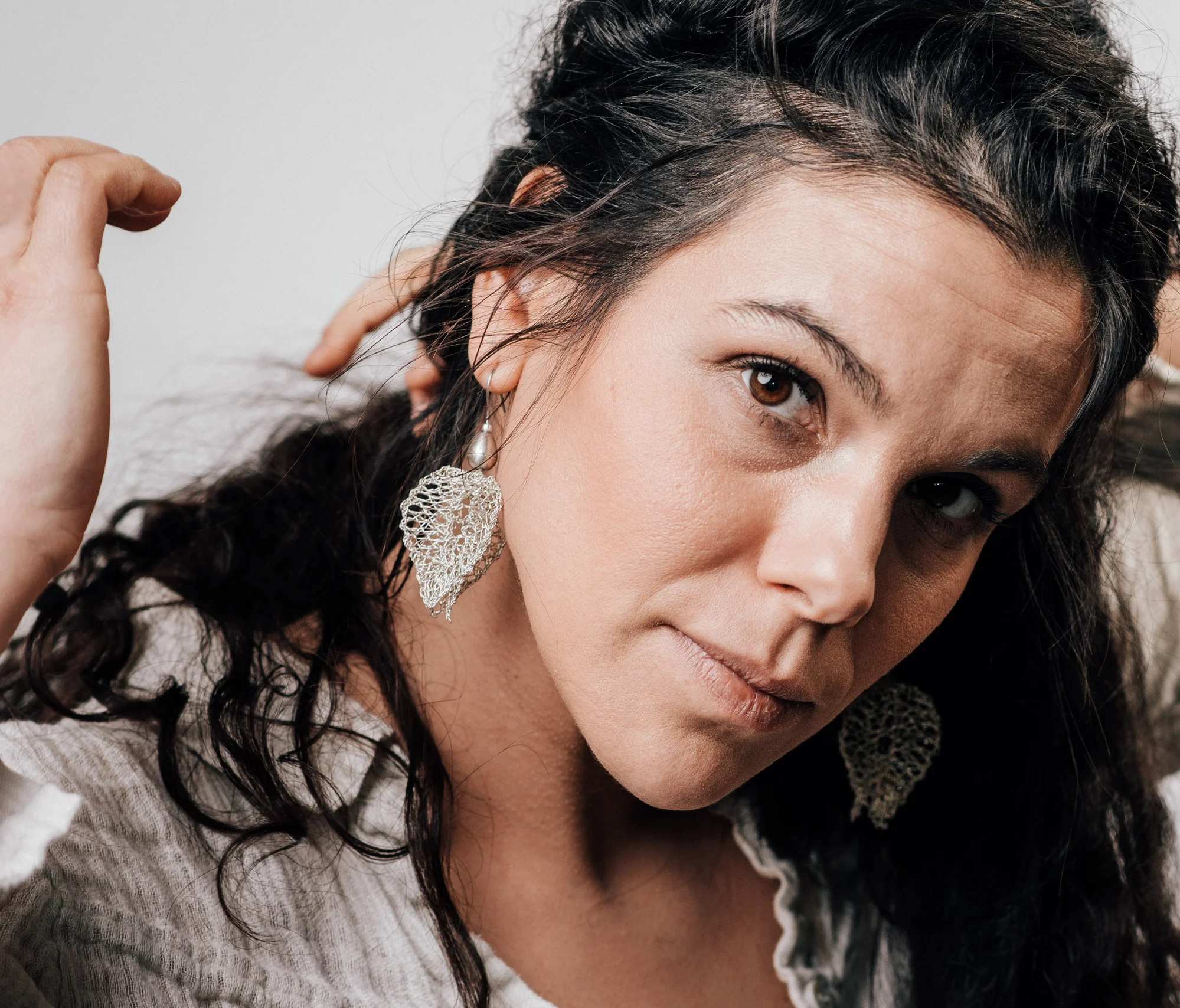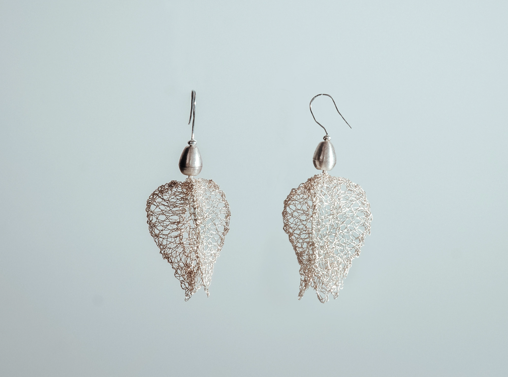 Egyedileg készült, ezüst drótból, csipkeverés technikával kialakított fülbevalópár, térbelisége és mérete ellenére könnyű, áttört. Ajánlom azoknak a menyasszonyoknak, akik a nagy napon szeretnének különleges, hangsúlyos, mégis elegáns, kézműves ékszert viselni. Az ezüst természetes fényessége tökéletesen illik a fehér ruhákhoz.