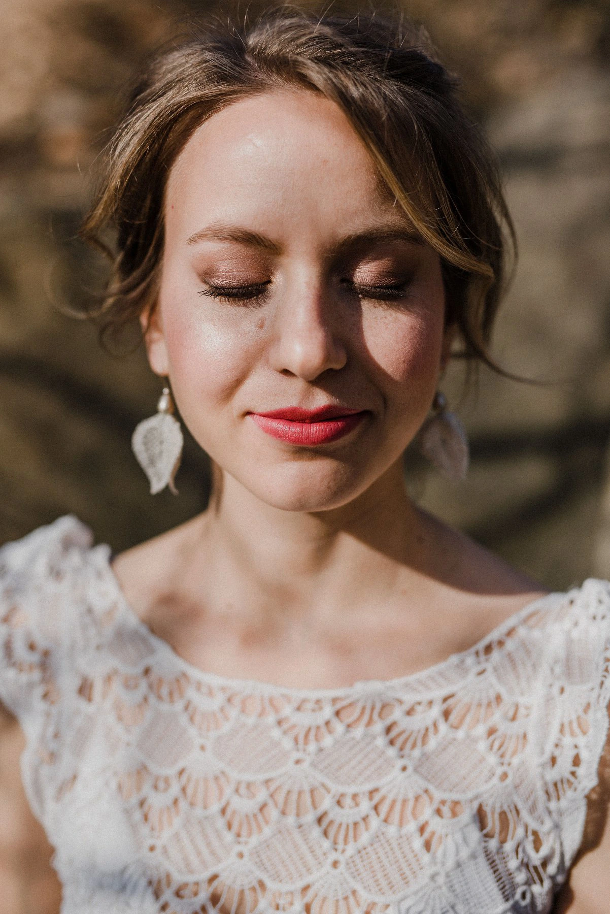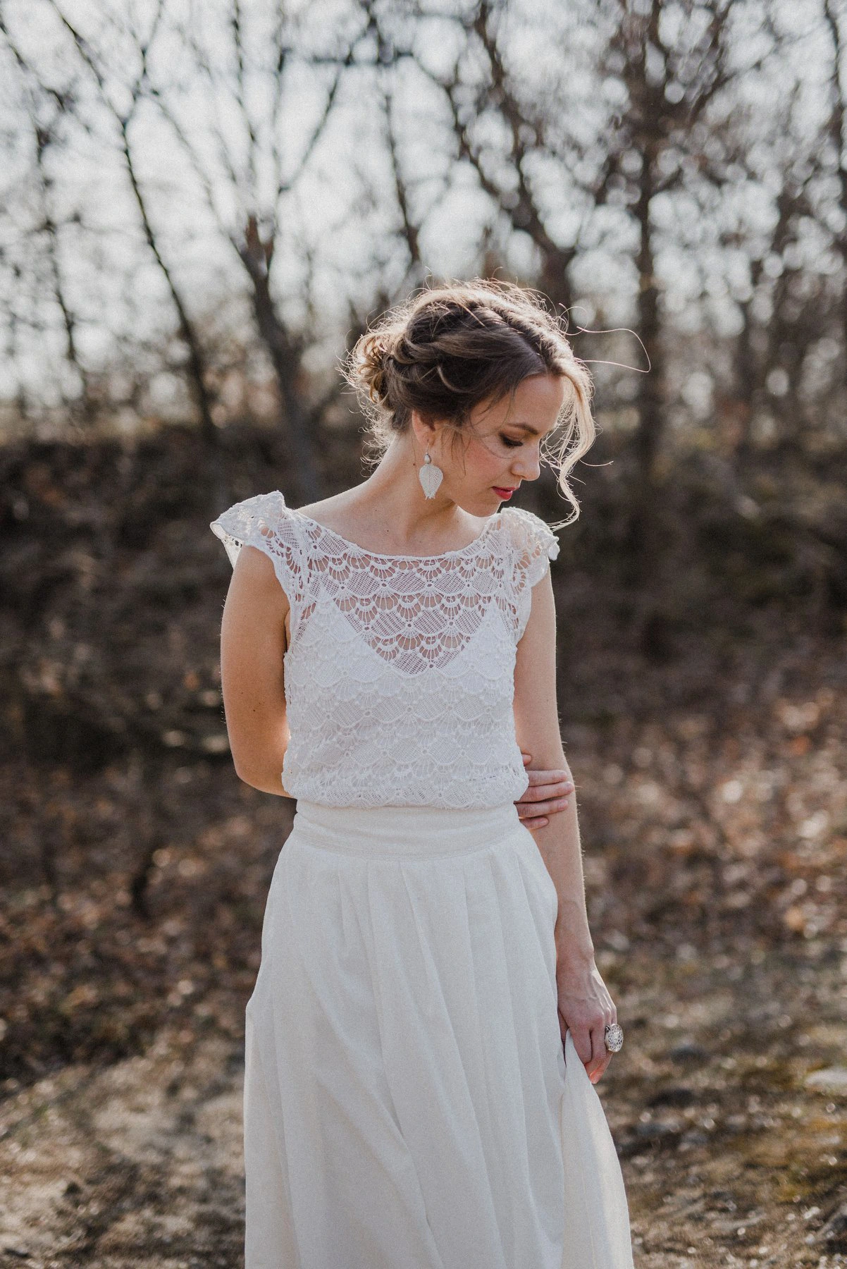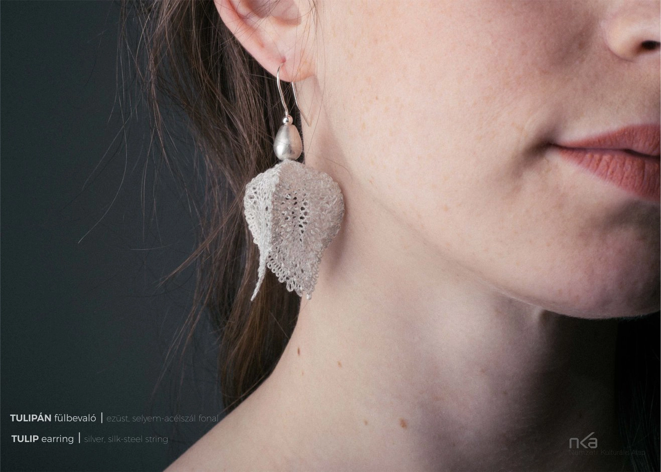 Egyedileg készült, vert csipke fülbevalópár. A selyem–acélszálból készült, kézzel vert csipkeelemet térbe fordítva foglaltam ezüst "foglalatba". A gyöngyvirág ihlette forma nyitott vonalvezetése egy nyíló virág érzetét kelti. Azoknak a menyasszonyoknak ajánlom, akik az esküvői ruhájukhoz megjelnésében és minőségében is méltó igényes kézműves ékszert keresnek. Egyszerűbb, letisztult vonalvezetésű ruhákhoz illik.