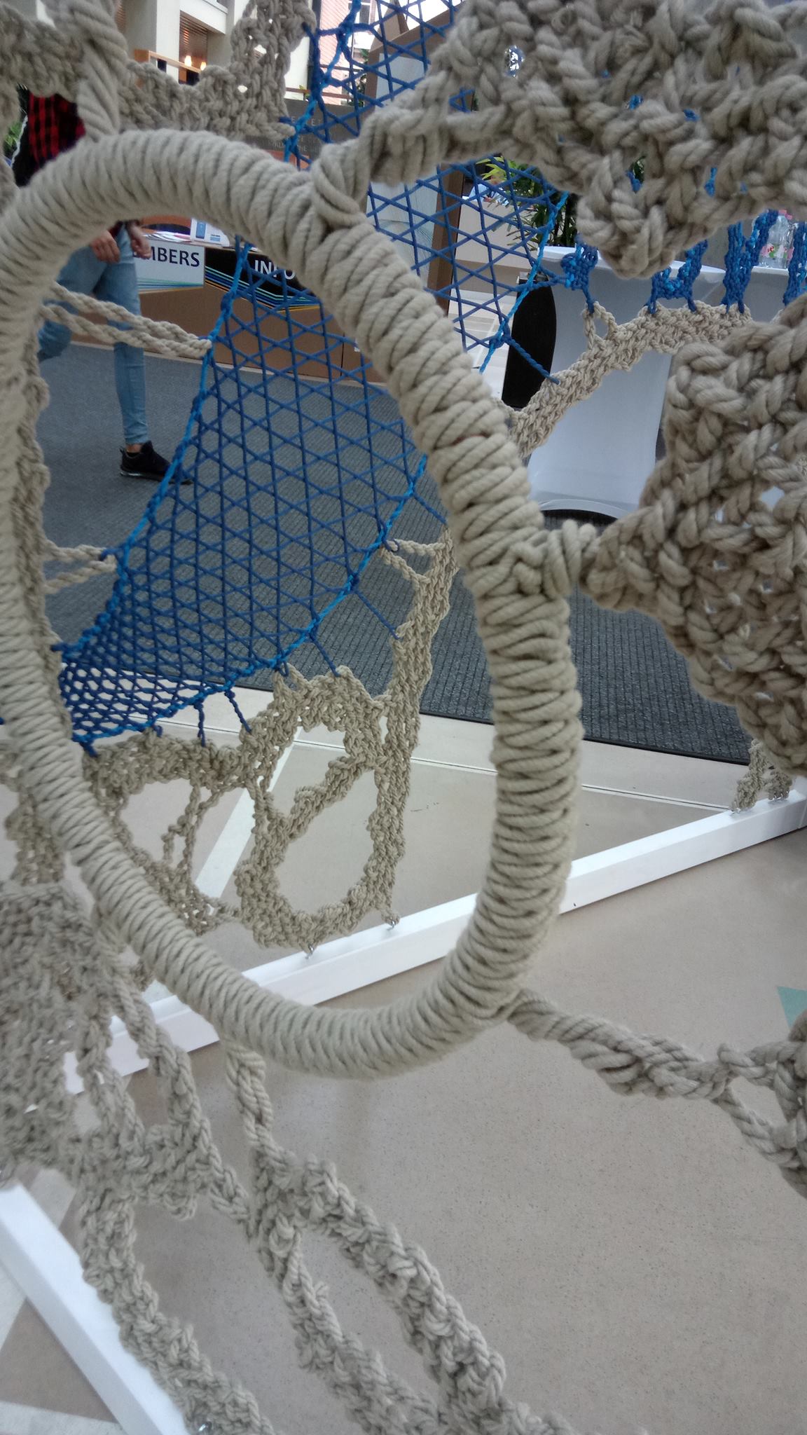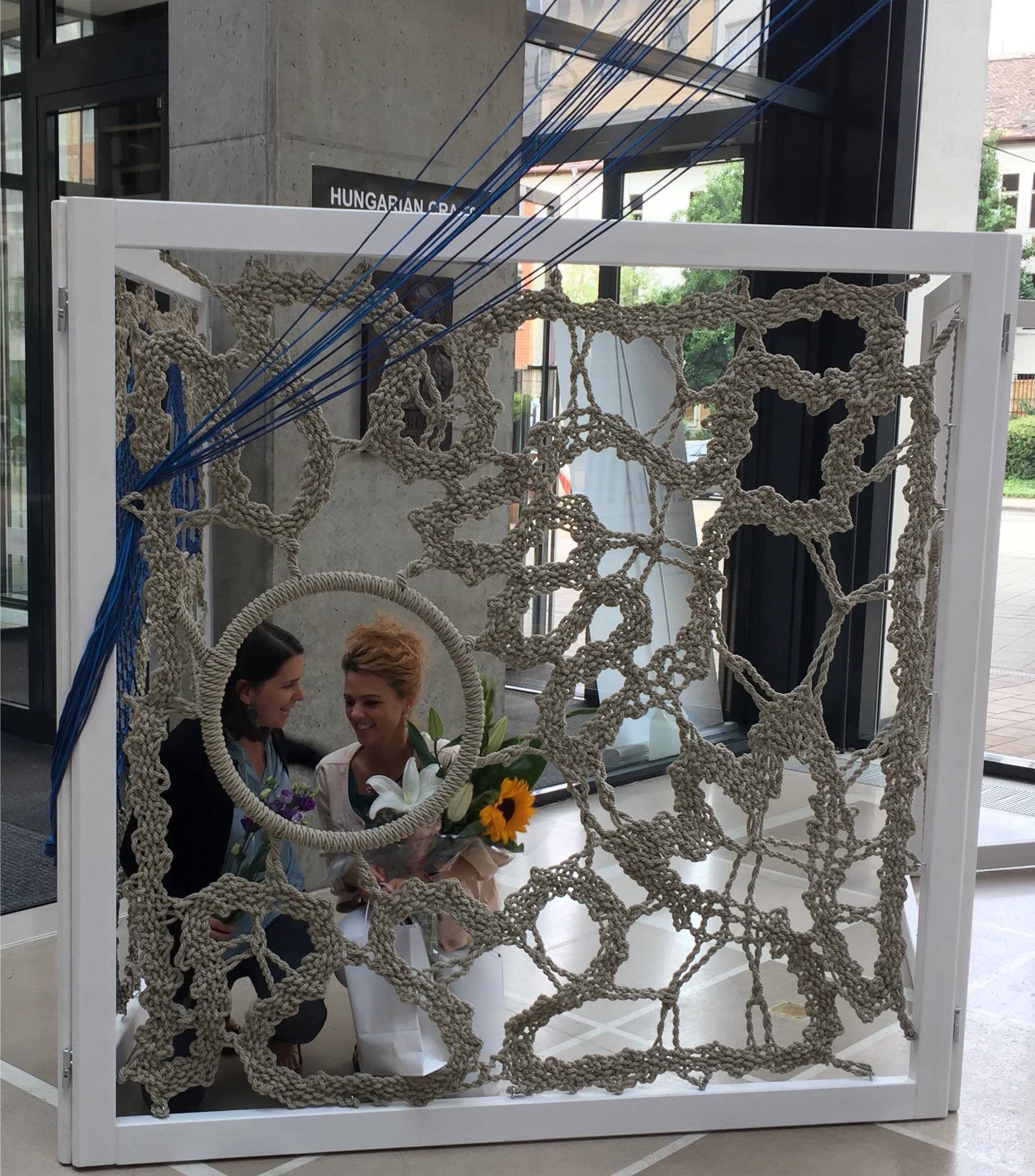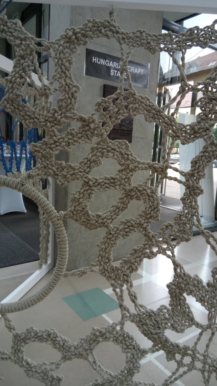 hinged, variable-shape installation composed of 2 m × 2 m elements, featuring bobbin-lace inserts made from ship’s rope—originally created for the Hungarian stand at the 2018 EHMA Conference.