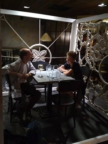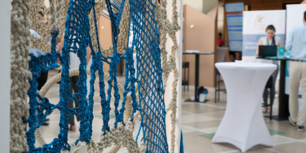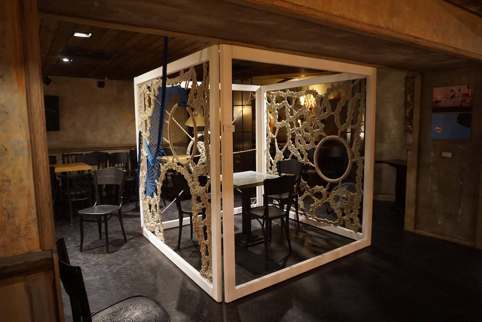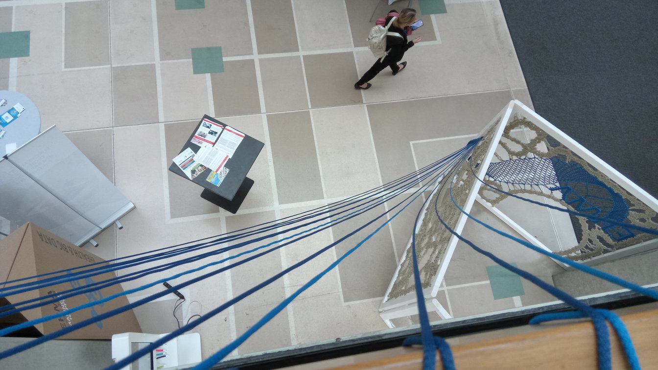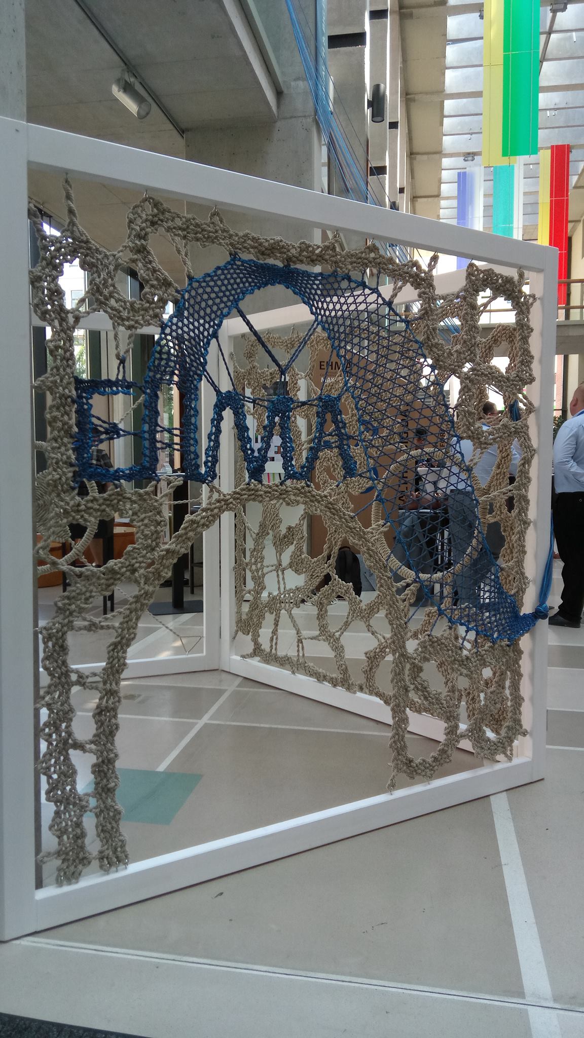 hinged, variable-shape installation composed of 2 m × 2 m elements, featuring bobbin-lace inserts made from ship’s rope—originally created for the Hungarian stand at the 2018 EHMA Conference.