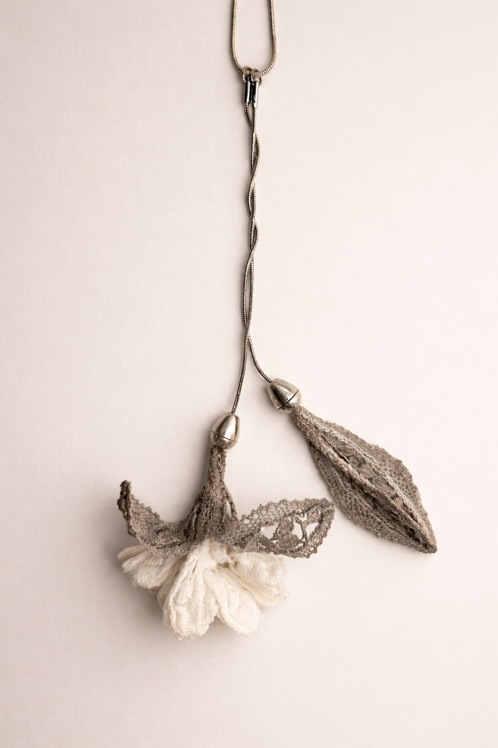 This necklace features a flower and a bud suspended from separate stems, which can be worn together or individually, depending on your preference. Crafted from silk–steel thread using a lace-making technique.