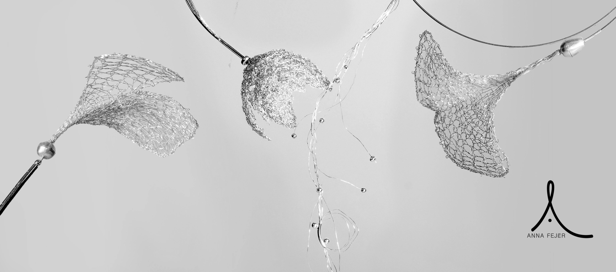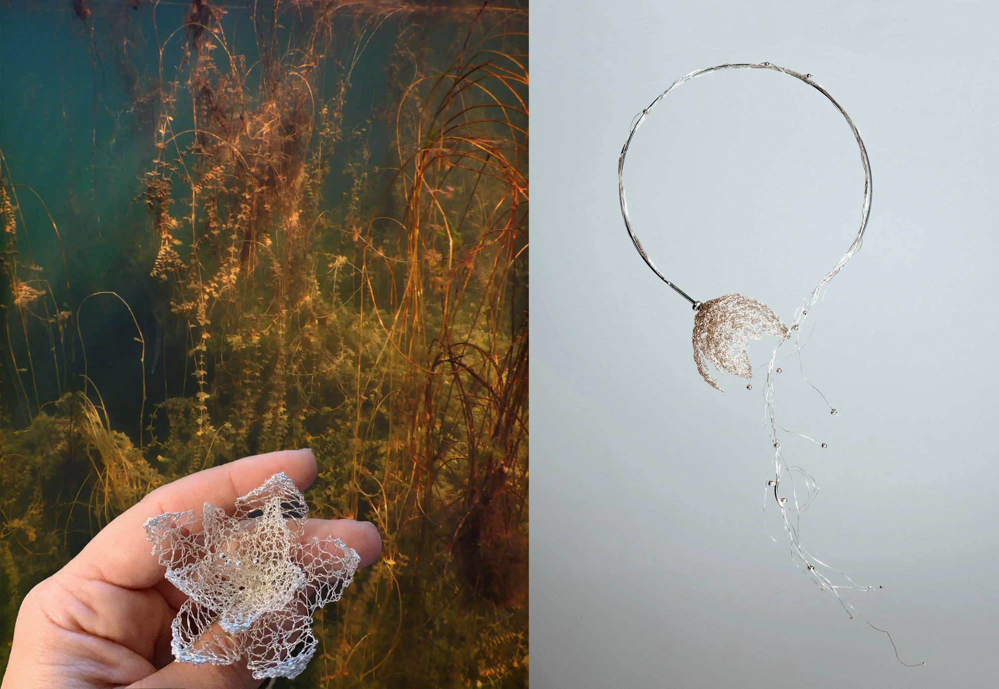 This piece is crafted from silver wire using a lace-making technique. The wires of the double flower cup pass through a silver bead, intertwining over the neck and then tangle playfully, evoking the delicate forms of underwater plants.